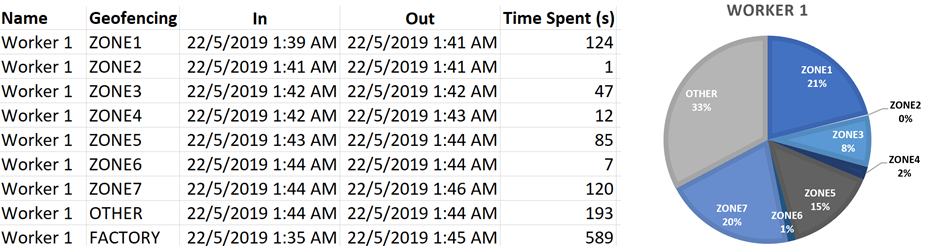 Stayed time of each worker in each location (zone) and pie chart statistic the percentage of working time/non working time daily.
